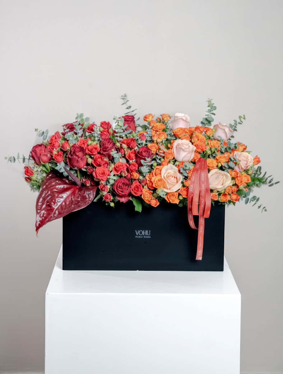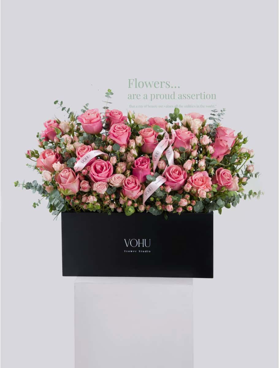 - طراحی: باکس گل با روبان یا باکس گل روبانی در مدلهای گرانتر، ظرافت بیشتری در دیزاین دارد. مثلاً باکس گل برای افتتاحیه یا باکس گل تولد مردانه در ردههای قیمتی بالاتر، جزئیات بیشتری دارند.
